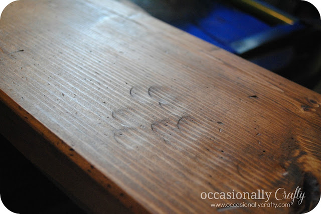 Next we weathered and stained the wood. I say we because my husband was a huge helper in all this! We are in the process of staining our fence so we used the same stain for the growth chart. We weathered it by smacking the board with a bag full of screws and taking a hammer to the wood. Once it was stained the effects looked pretty awesome!