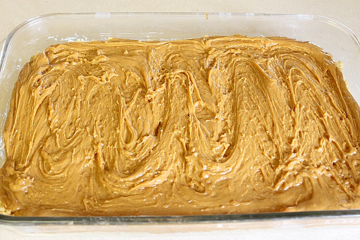 Remove RK from fridge, and spread the peanut butter/caramel layer over the top.