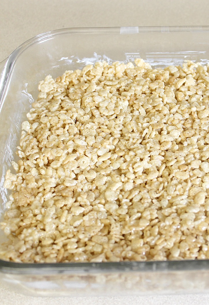 Start out like you usually make your RK treats. Melt your butter and marshmallows together in a pan, then stir until smooth.