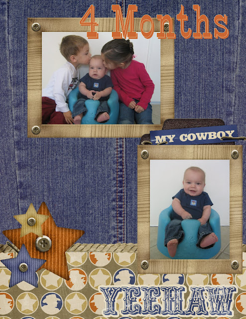 Somehow I missed scrapbooking my son’s 4 month pictures, so I pulled together a page using a kit from Peppermint Creative. It’s called Little Buckaroo and is totally adorable! I only wish I had pictures of my kids dressed as cowboys- it would be perfect! Sadly, mine prefer superheros and such. I do have this picture of my son, wearing a cowboy holster and a skirt. He calls himself a “scary dancer”. That’s about as close as we get.