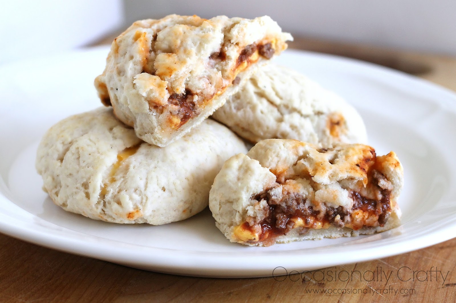 Roll out each biscuit until it is flat and round. Place two small squares of cheese in the center, then pile your meat sauce on top of the cheese.