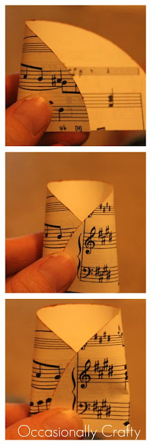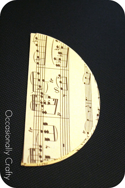 (I would just like to add how much, as a former music major, it PAINED me to cut up perfectly good sheet music. But, most likely, I will never again perform a flute concerto. Even though I spent hours practicing that music. Hours. Anyway…. at least this way I am using it instead of the music wasting away in a closet.) 2. Ink the curved edge of each semi-circle. Make sure you can see ink from both the front and back.