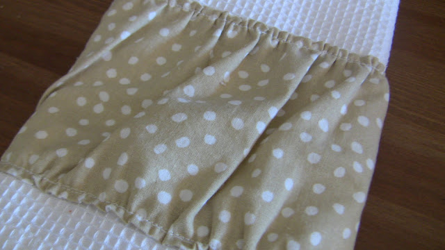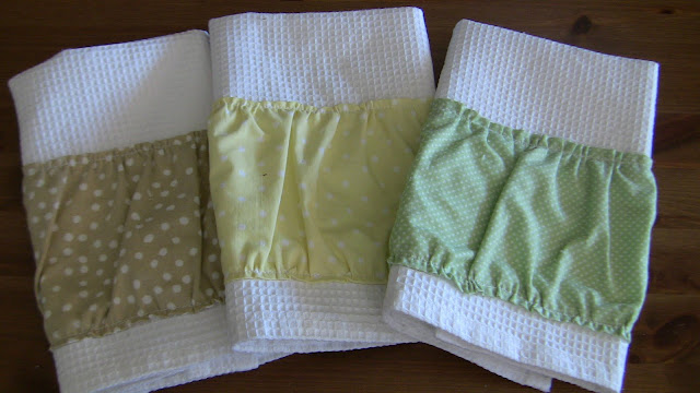 I decided to buy her something off her registry, then make something to match it.  So, I bought her these mixing bowls, then bought fabric to make these ruffled dishcloths (thank you Rebekah at McGee and Me).