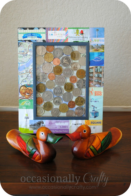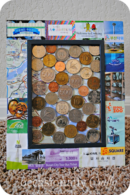 Most of you know that our family spent two years in Seoul, South Korea for our assignment with the military. It certainly was an interesting few years for us with some very high highs and very low lows. We’ve been back in the states for nearly 7 months now and some of those lows are fading from memory, and the awesome things we experienced are staying. Before we left we exchanged our Korean money for American money, but I held onto a cup of Korean coins. I’ve always loved looking at foreign coins, and these were some that we actually used and became familiar with. I had to find a way to preserve and display them since my cup wasn’t very pretty 🙂 I saw on pinterest someone who put their coins in a picture frame. I thought it was a great starting point, but i didn’t want to just stick them in a frame and be done with it. So instead I took all of these: