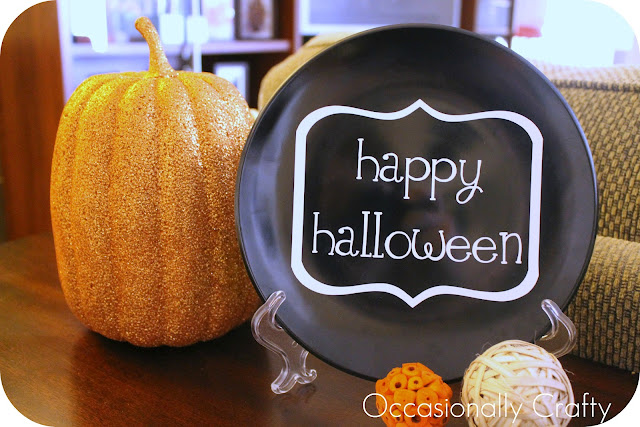 These Halloween plates were inspired by these cupcake toppers. I think they are such cute, simple designs, and they would look great on a plate. However, my Halloween decor is mostly black and white with a little bit of orange, so I kept mine simple. Here’s what you’ll need to create your own.