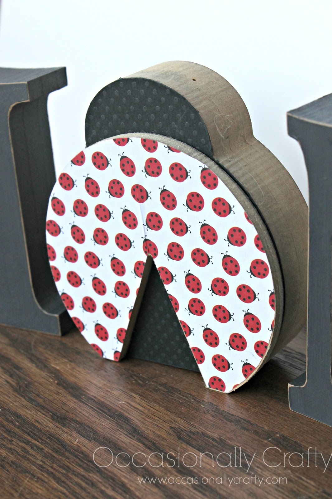 I have been meaning to buy them for awhile, and finally ordered them, plus an unfinished ladybug for summer. I painted my letters with DecoArt’s new Americana Decor Chalky Finish paint in Relic, which is a really dark gray. I love it! It went on with great coverage, so smoothly, and then I sanded the edges slightly. Then I Mod-Podged some cute Bazzil dotted cardstock on the body of the ladybug, and finished up with this cute Ladybug paper for the wings. Ladybugs on the ladybug- is that too cheesy? I think it looks so cute!