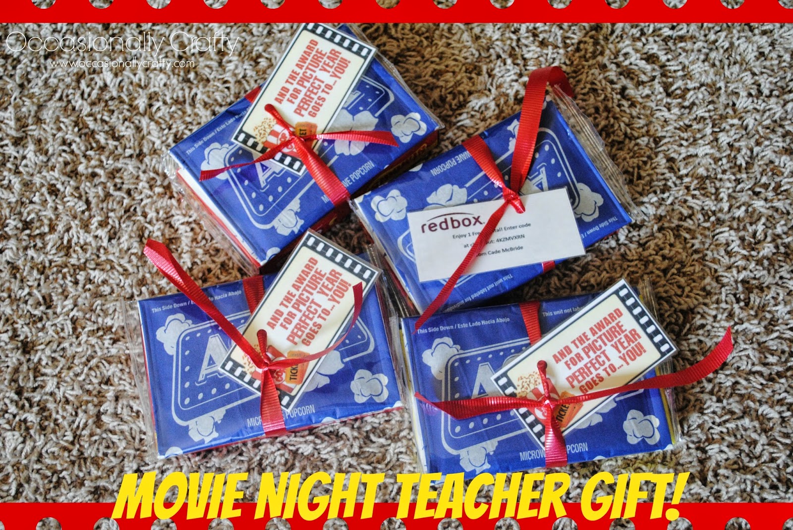 I’m always torn on what to do for teachers. There are lots of cute ideas out there, but my kids have a lot of teachers. They see a different teacher for reading, a different one for math, music, art, P.E., poetry, language arts, spelling… ack! That’s a lot of teachers. They’ve all had an impact on my children’s education so I want to thank them all without breaking the bank. I also like to give the teachers something they’ll use. I think I nailed it on the head with these ‘movie night’ thank you gifts!