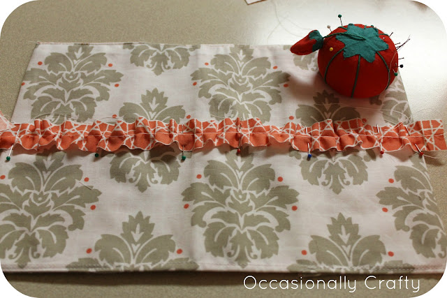 4. For my ruffle, I cut an inch off the extra napkin fabric, ran it through my sewing machine using the longest stitch possible and the highest tension on my machine, and I had a quick little ruffle strip. If you are making a ruffle, it needs to be 1 1/2- 2 times the length or height of your cover, depending on how full you want your ruffle. I sewed mine along the width of the cover.
