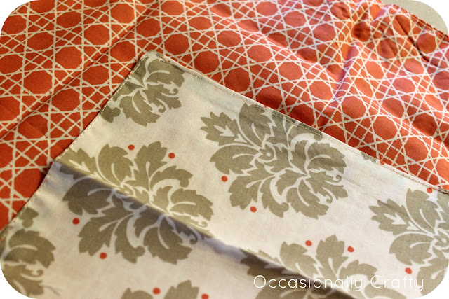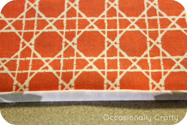 3. WHAT I SHOULD’VE DONE NEXT: I wanted to use the contrasting side of the napkin as a ruffle embellishment. I wanted it to go across the outside of the cover, not on the inside flaps. If you’d like to add any kind of sewn embellishment, do so now, BEFORE you sew the flaps.