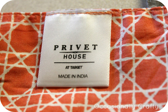 I kind of love the stuff from Privet House. They produced some home decor items just for Target. I saw these napkins and fell in DIY love. I really just adore the color combination of neutrals with coral/tangerine/whatever you want to call this color.