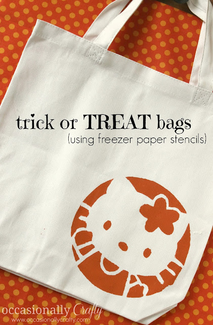I just realized that my best shots are all of different bags. I made three-one for each kid. I have to warn you- the black had some freezer paper “residue” left on it. That’s never happened before! I think maybe my iron was too hot. So be careful, kay? Enjoy your custom treat bags, and enjoy your trick-or-treating!