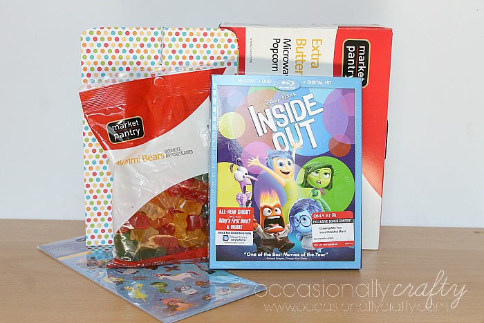 The front pocket holds some Inside Out stickers and some Market Pantry gummy bears in a baggie. You could include your recipient’s favorite candy instead. Gummy bears happen to be my weakness 🙂