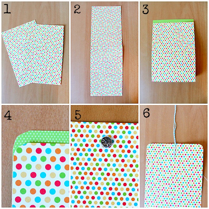 1. Cut an 8.5×11 sheet of scrapbook paper in half to have two 8.5×5.5 pieces. Score each piece of paper 3/4 upfrom the short edge. If you don’t have a scorer, simply fold your paper up 3/4 inch from the short edge and crease. 2. Overlap scored or folded pieces and glue in place. You should know have one long sheet with a somewhat flat section in the middle. 3. Fold your wrapper in half, making sure the side you want on the outside is facing up. 4. Round corners if desired. 5. Find the center of your front piece, and 3/4 inch down, punch a hole and insert your decorative brad. Secure brad in place. 6. Find the center of your back piece, and again, 3/4 inch down, punch a small hole and insert a piece of baker’s twine or string. Do this by folding your twine in half, then pushing the loop through the hole and over the ends of the twine to secure. This should go up and over the top edge of the back side, and the end pieces will go over the top to wrap around the brad when the DVD is in place.