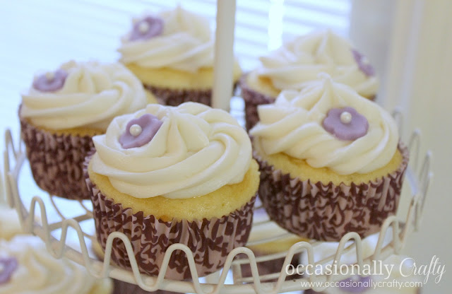 Of course, no gathering is complete without cupcakes, so I made French Vanilla cupcakes with Vanilla Buttercream Frosting, embellished with fondant flowers and sugar pearls.