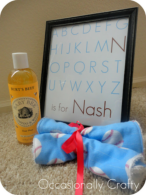 I paired it with a few handmade washcloths and some deliciously-rich baby shampoo. Cute and practical.