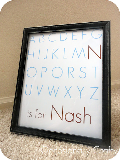 The printable comes from an idea I saw on Pinterest. It was not linked back correctly, however, so if you know who originally created this, I’d love to know so I can give proper credit! I used Picnik to create my own version using her son’s name.