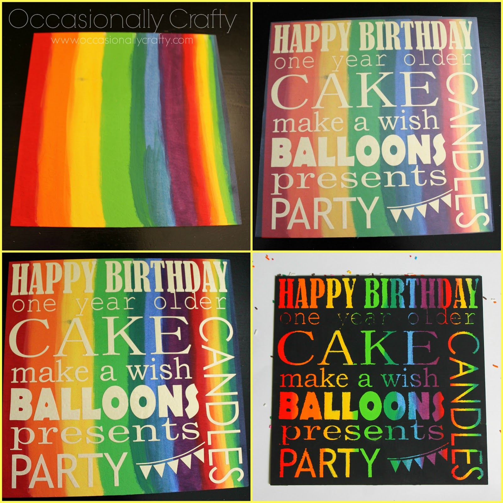 I’ve been wanting to try this kind of PVPP project for awhile (Paint, Vinyl, Paint over, Peel). In this style of project, you paint your base coat in rainbow colors so that’s what will end up showing through in your letters. I’ve seen this used in all sorts of ways, so I finally gave it a try.