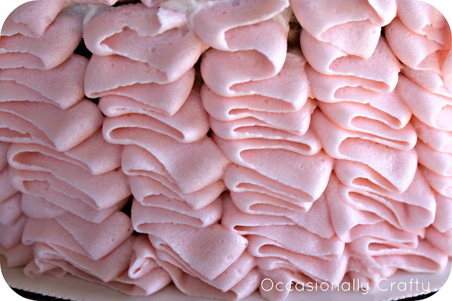 She loves everything pink and girly, so I decided to make her a pink ruffle cake. I’ve never done anything like this before. I turned to this video for guidance, and here’s how it turned out: