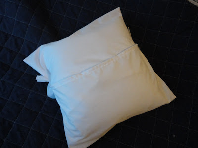 Well, let me tell you- this was easy as can be! If you can stitch four straight lines, you can make this pillow cover. I actually did make it into a 30 minute pillow, only because I wanted to add a little decoration. First off, I found my pillow form at Goodwill. It was only $3, and I got it on sale with their “colored dot of the day” discount. They have TONS of pillows at thrift stores. If the thought of using someone else’s pillows creeps you out a little, most of the forms are washable- and compared to what you’ll pay in a store for a new one, I can handle it. I made the pillow cover following the tutorial exactly. (Here’s what it looked like from the back….)