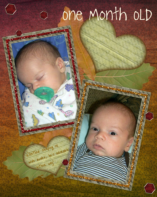 I thought I’d try something new this week. Usually, I create my scrapbook pages with my scrapbook software, Creating Keepsakes Scrapbook Designer. But I noticed my favorite online photo editer, Picnik, has a few scrapbook page layouts. I thought I’d try one out. They don’t have a huge selection unless you upgrade to Premium, but even at the basic level there are a few cute ones. It’s also a great place to create photo collages, cards, even blog buttons! Anyway- it was super easy to do, and perfect for my little fall baby.