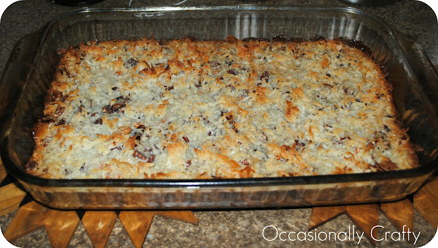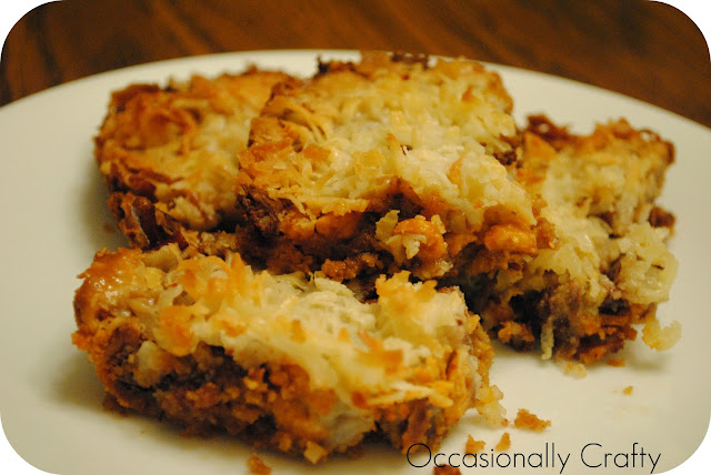 Seven Layer Cookies 7 plain graham crackers 1/2 cup of butter 1 cup butterscotch chips 1 cup chocolate chips 1 cup chopped pecans 1 cup coconut 1 can sweetened condensed milk Heat oven to 325 with the stick of butter in your baking pan. It will melt as you crush your 7 graham crackers into a fine dust. [I usually just put them in a ziploc bag and let the kids have it with a rolling pin.] When your oven is preheated pull out the baking dish and evenly distribute your graham cracker crumbs to form a great crust. Add the next 5 ingredients in order, being careful not to let the condensed milk gather in the corners since it won’t cook well and tastes kinda… interesting. If you have a hard time pouring your condensed milk, stick the whole can in a cup of hot water while you’re preparing and it will be easy to pour over your creation. Cook for 30 minutes and voila!