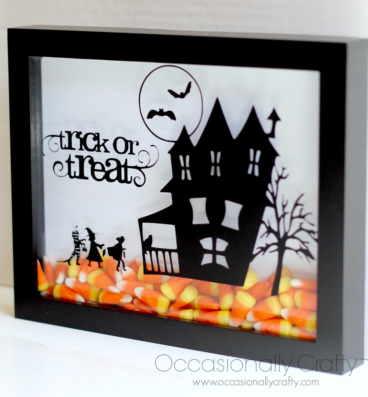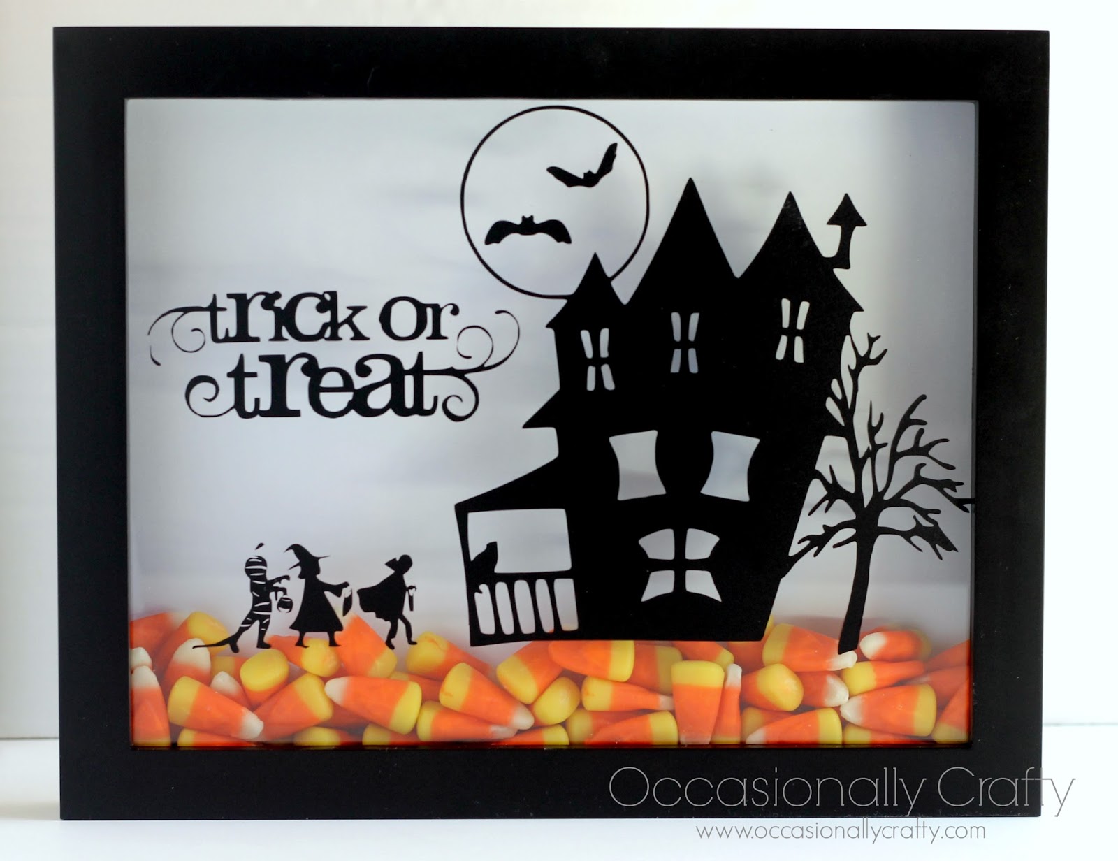 I love to craft with my Silhouette, so I put together an awesome haunted house and combined it with some trick-or-treaters. A little “Trick or Treat” word art was the final touch. I cut my design out of black vinyl and applied it to the front of an 8×10 shadowbox.