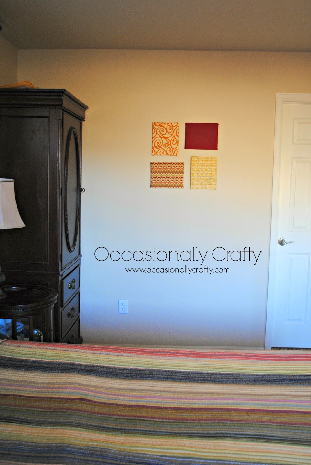 I used my staple gun to staple the fabric around the canvases, and nailed some picture hooks on the back for hanging. Then I just had to do a little measuring and eyeballing to put it on the wall just right!