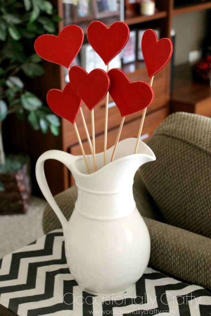 Buy some wooden hearts and skinny dowels at the craft store. Paint your hearts the color(s) you want. Lightly distress if desired. Put a big dollop of hot glue on the back of the heart, then press the dowel in. Let dry. Voila!